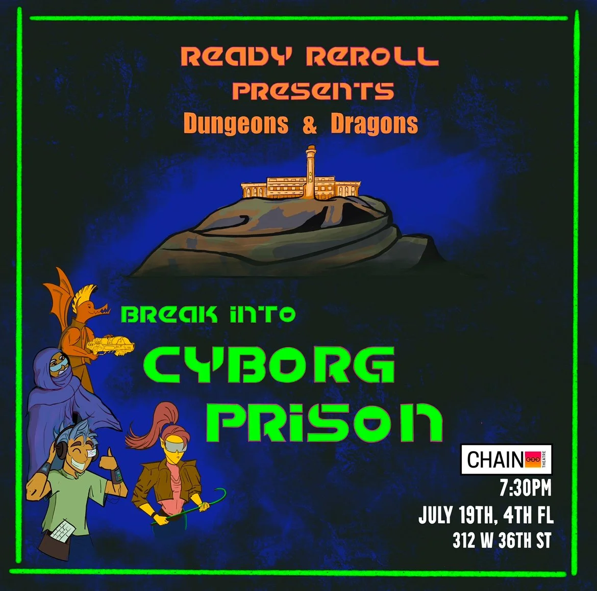What's harder than breaking out of prison? Breaking into prison! Especially when it's full of god damn terminators. Come join the adventure as Ready ReRoll continues its Cyberpunk Dungeons and Dragons run with "Break Into Cyborg Prison"! Audience members play the NPCs!