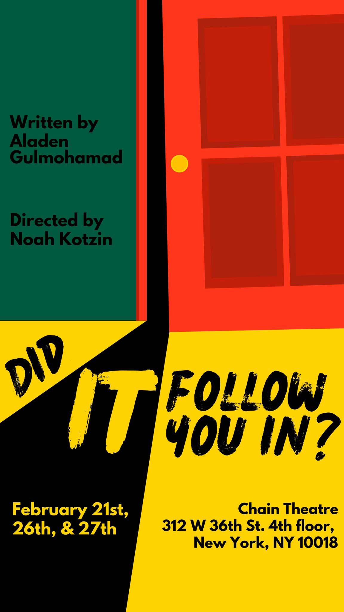 Did It Follow You In is a short horror play about the superstitions we use to distract us from the real terrors. A couple looking for their missing son are terrorized by a shapeshifting monster.