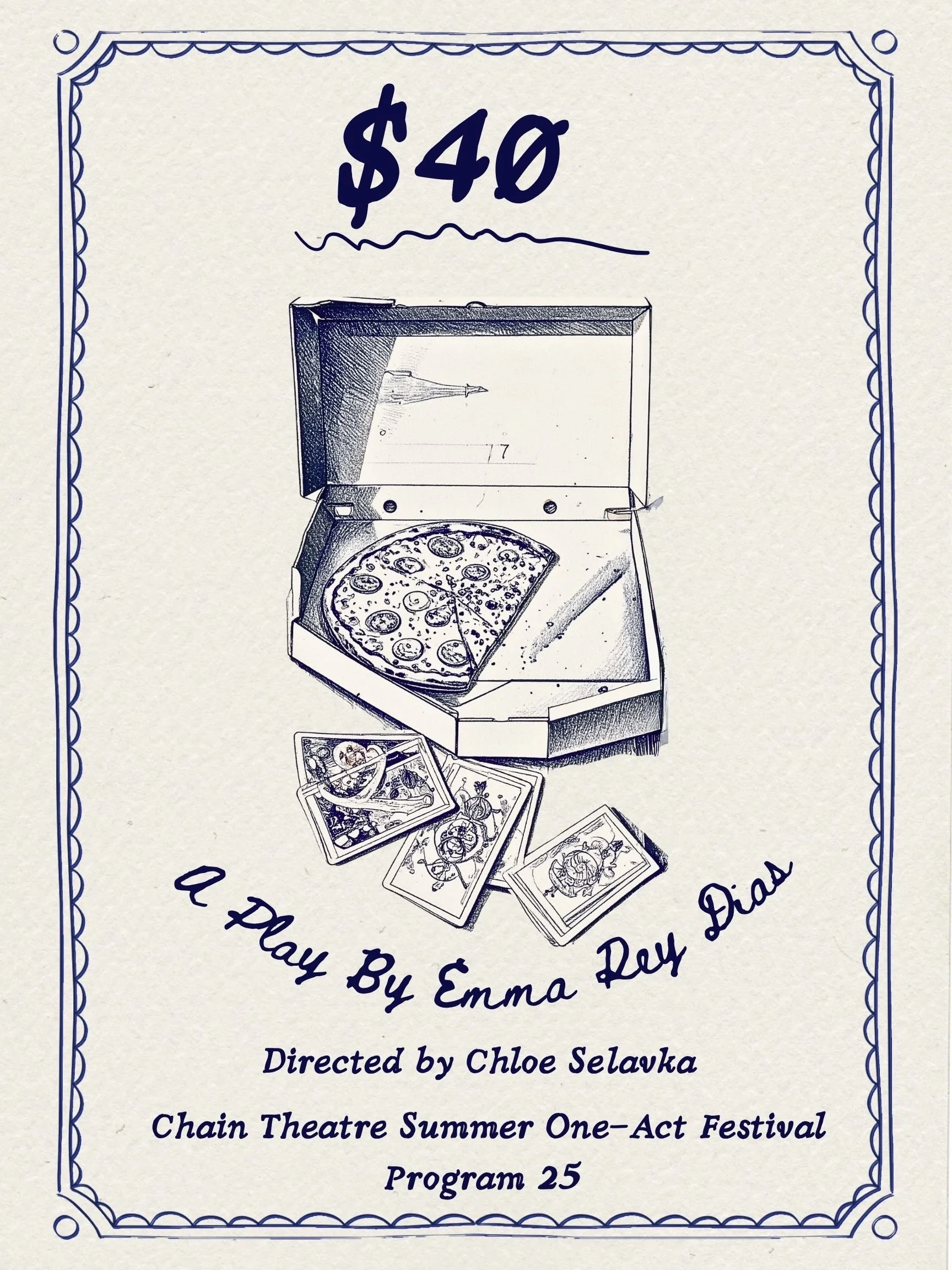 Director: Chloe Selavka (she/they) is a playwright, director, and artist originally from Worcester, MA, now based in NYC. She creates work about and for hopelessly romantic women who hold love to hold a grudge. She wrote and directed Synonyms for Goodbye, featured in the Chain Winter One-Act Festival earlier this year, and wrote and produced Peonies (Don’t Leave) in this festival (Program #12). Chloe would like to thank Emma Rey Dias for writing her bio. You can see more about her on her Instagram @chloverrs!
